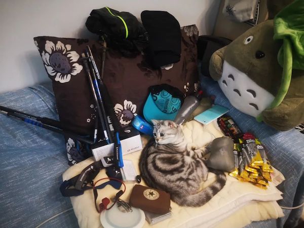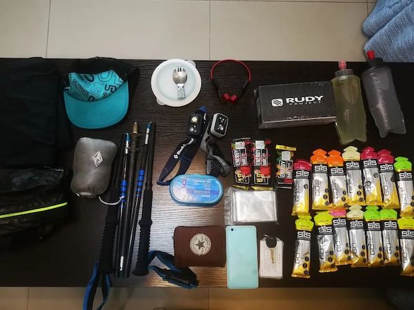 我在實測中一共裝了如下物品:一對手杖、兩個水壺、兩個頭燈、一件沖鋒衣、一條沖鋒褲、一件羽絨背心、一個遮陽帽、一個帶眼鏡盒的太陽鏡、一個折疊塑料碗和勺子、一個裝滿的錢包、一個6英寸手機(jī)、一個鑰匙、14支sis能量膠、3根能量棒、一個急救包、一個韶音骨傳導(dǎo)耳機(jī)。