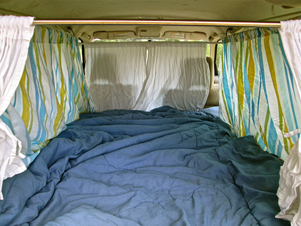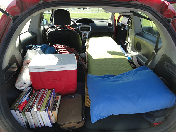 現(xiàn)狀是,你個子高,你的車短,讓你很難伸展開來。但是,如果你盡可能地將前排座椅推向前方,然后填滿后面的空隙,即便關(guān)上后備箱門,你的頭和腳都會有足夠的空間。將行李箱和背包塞進這些空隙,上面鋪上泡沫睡墊/氣墊和枕頭,就可睡眠無憂。